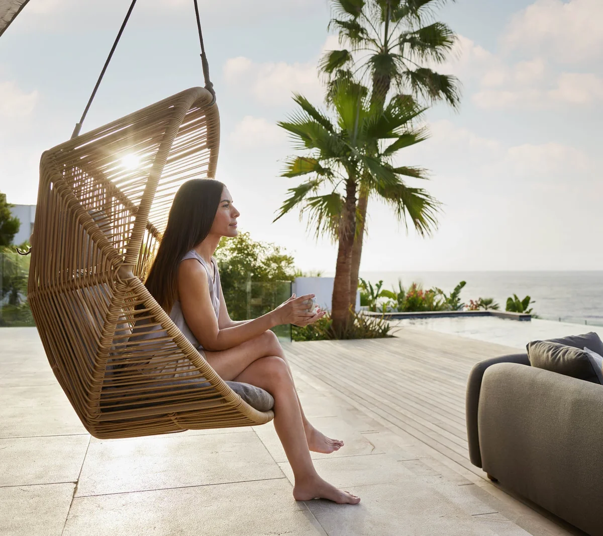 La silla Hive tiene una silueta escultural que la hace perfecta para ser el centro de tu espacio exterior, ya sea sola o en grupo. Está diseñada por el dúo danés Foersom & Hiort-Lorenzen MDD. La inspiración de Hive proviene de la forma de una colmena, que se ve en la estructura y el diseño únicos y acogedores, que crean un espacio para la concentración, la contemplación y la reflexión. La colmena está fabricada con el resistente tejido Cane-line Weave® en un trenzado artístico y transparente. Puedes optar por colgar la silla con una cuerda resistente, o colocarla sobre un marco robusto de teca o aluminio. La silla Hive viene con cómodos cojines y un reposacabezas ajustable para un apoyo óptimo. Los cojines cuentan con el sistema QuickDry & Airflow, que garantiza que los cojines estén secos aproximadamente una hora después de que llueva.