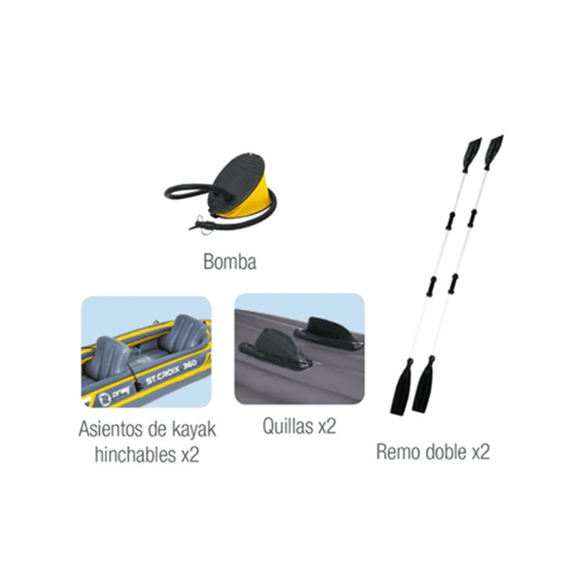 -Incluye: Remos de 2,21m + 2 asientos inflables, pasa-pies y bombín.