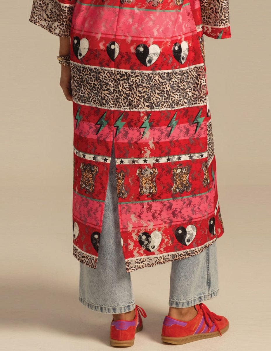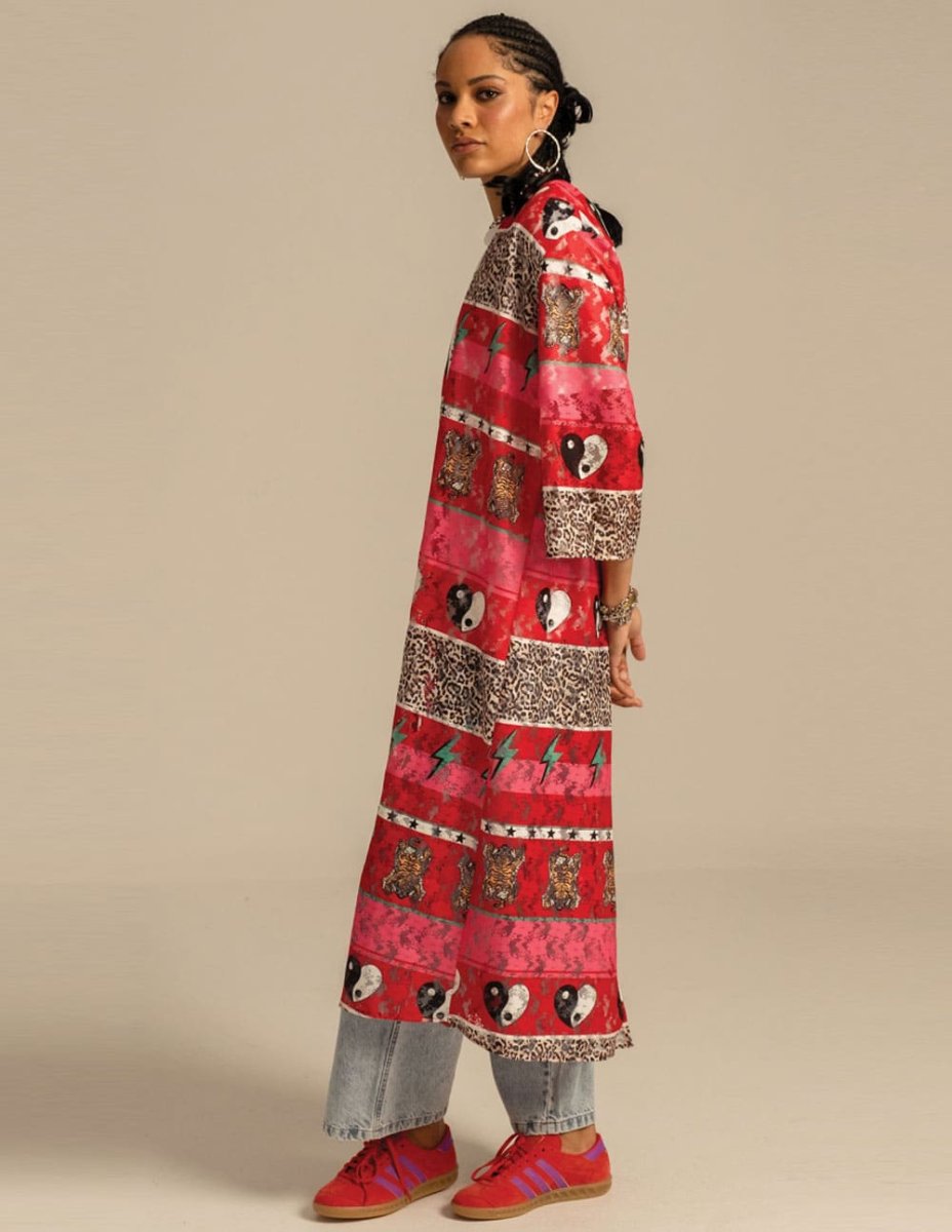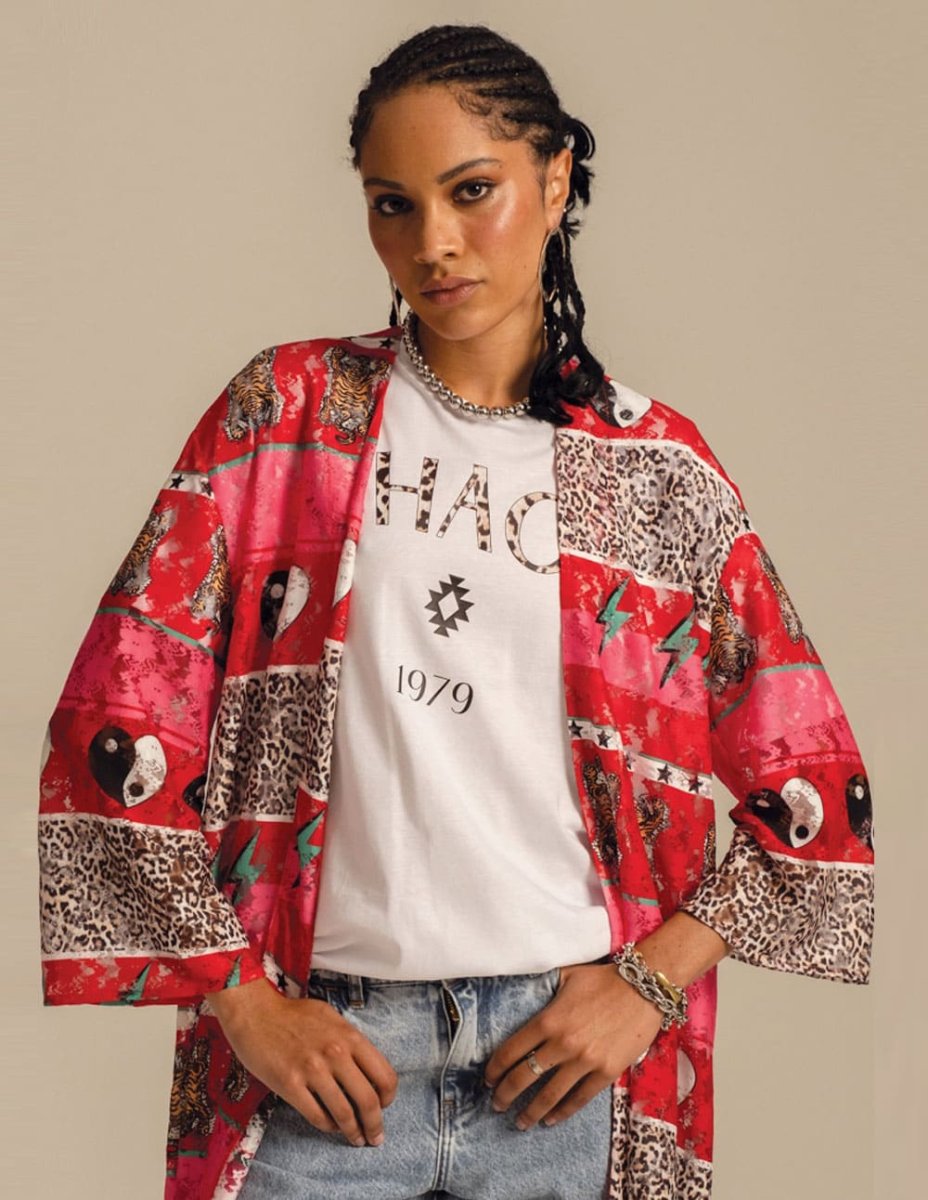 El Kimono Peace and Chaos Equinox Lace Multicolor fusiona estilo bohemio y sofisticación en una prenda llamativa y versátil. Con su estampado vibrante, aporta un toque único a cualquier look. Ideal para superponer, ofrece ligereza, movimiento y un aire artístico perfecto para destacar con personalidad.