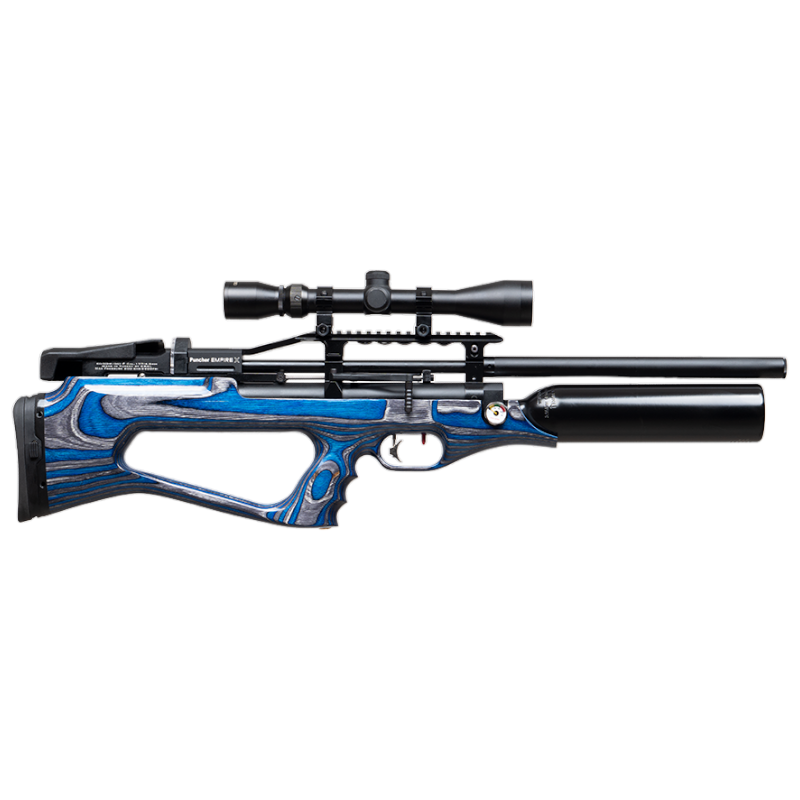 El Kral Arms Puncher Empire X es un poderoso rifle de aire comprimido PCP en configuración bullpup con una culata hermosa laminada azul, con una mejilla ajustable y una almohadilla de altura ajustable que absorbe los golpes. La empuñadura de pistola de forma ergonómica proporciona un agarre estable y cómodo. Tanto la primera como la segunda etapa del gatillo se pueden ajustar e incluso tambien se puede ajustar la altura e inclinacion. La seguridad manual se puede desactivar con el dedo en el gatillo.