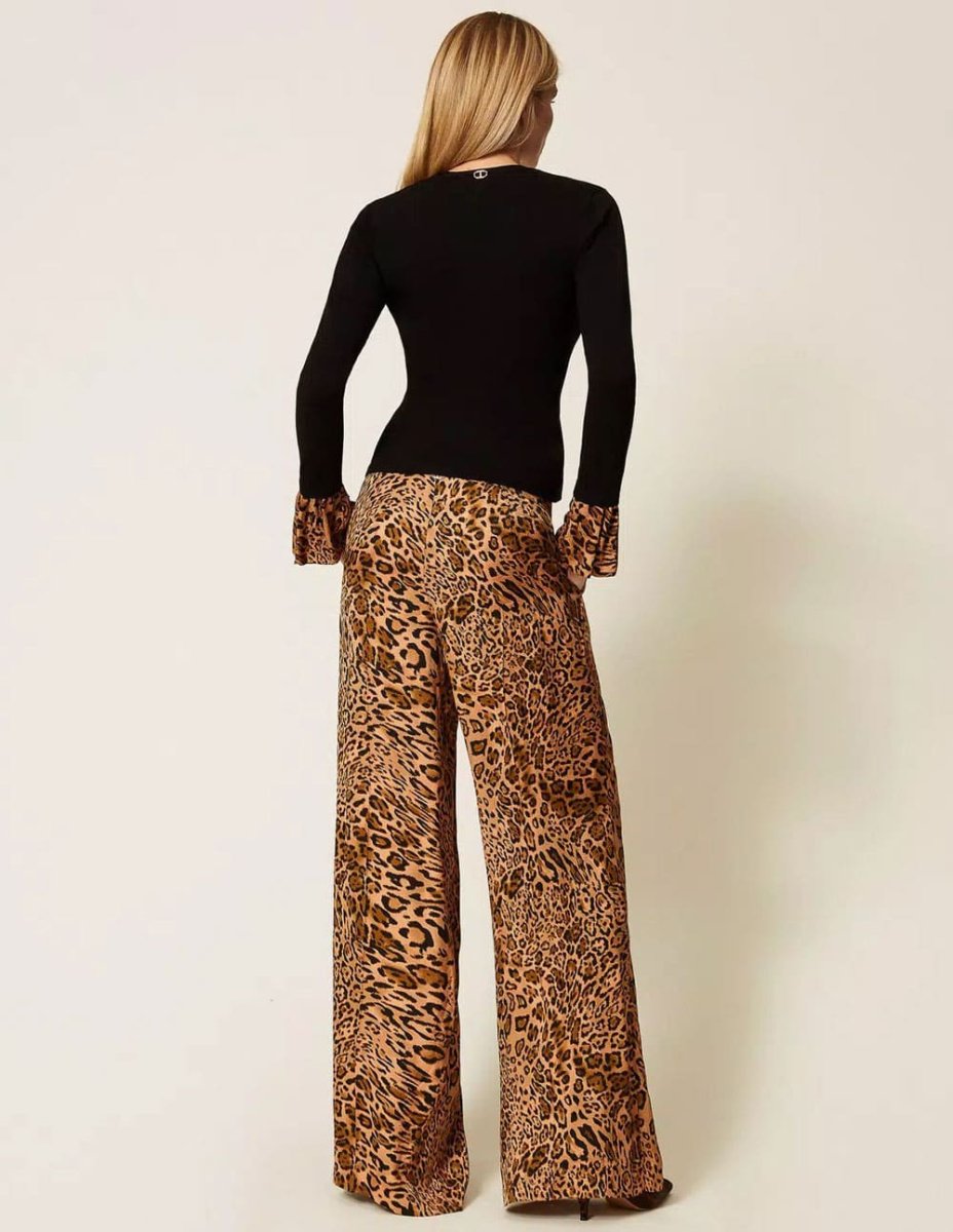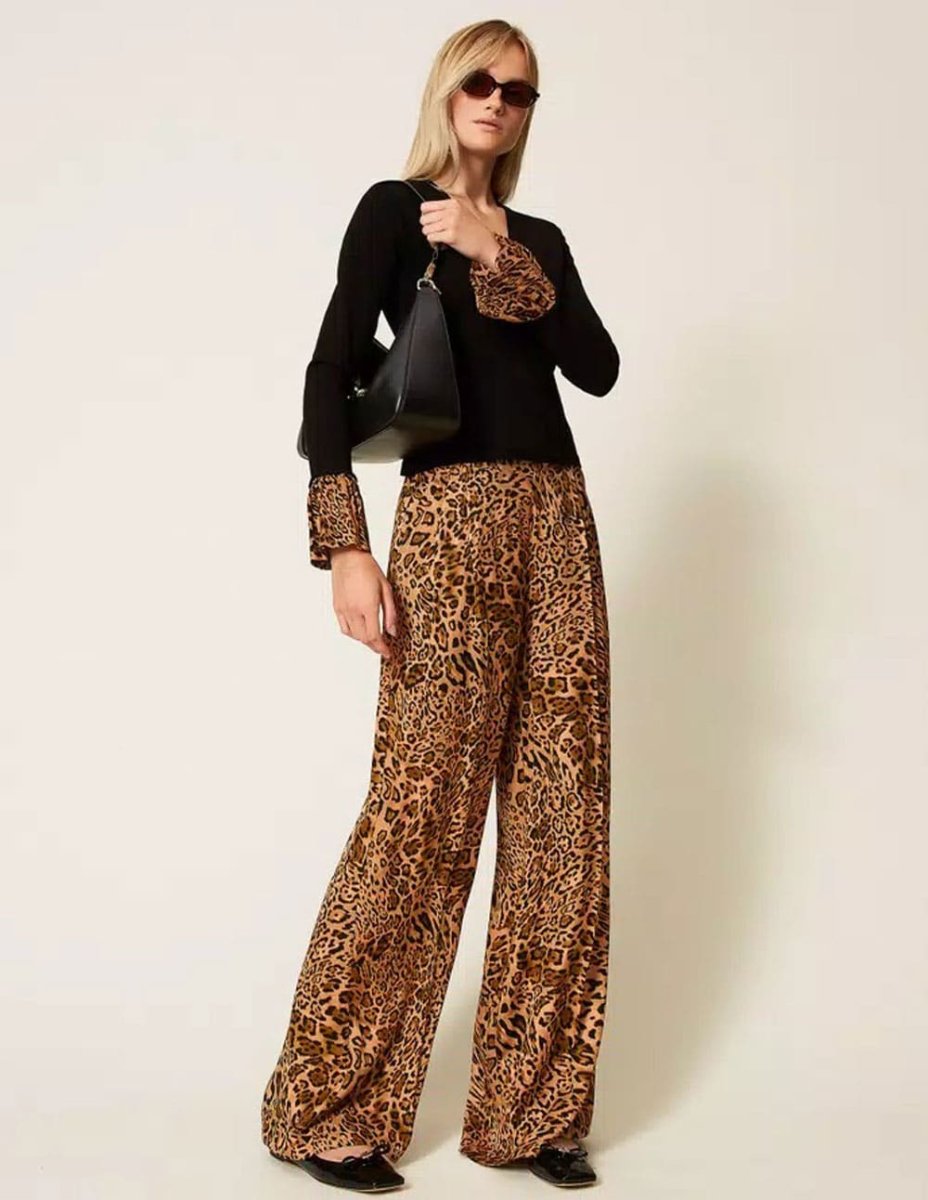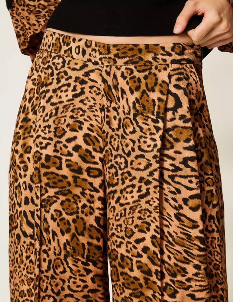 El Pantalón TWINSET Animal Print Marrón destaca por su diseño moderno y audaz. Confeccionado en tejido suave y cómodo, su estampado animal print aporta un toque de estilo único. Ideal para looks urbanos o sofisticados, se adapta a diferentes ocasiones con elegancia y personalidad, realzando cualquier conjunto.