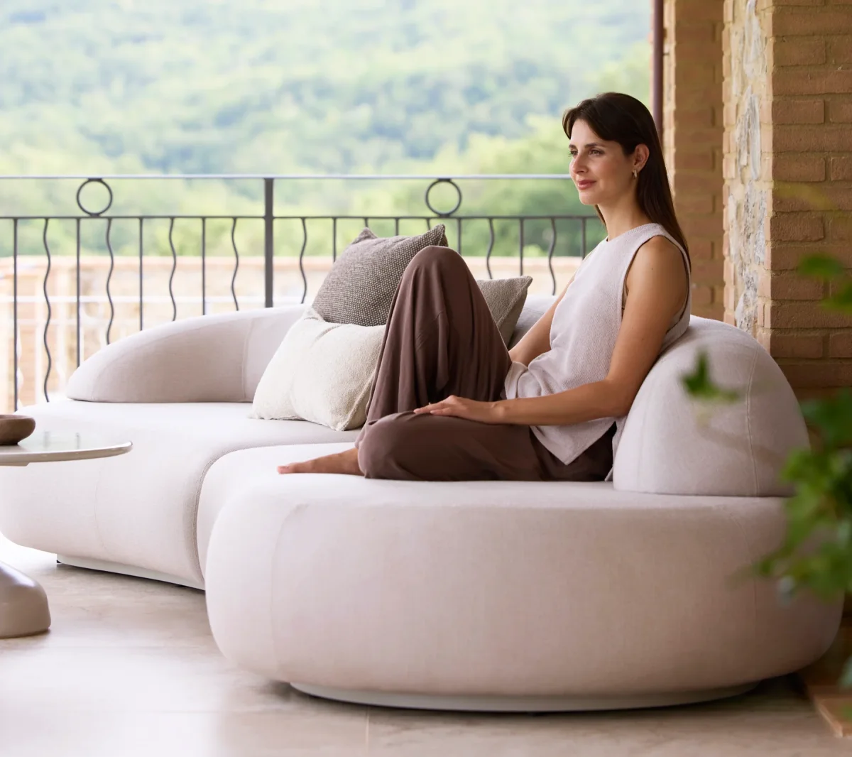 El sofá Mellow de 4 plazas, que combina módulos con un reposabrazos largo y un reposabrazos corto, ofrece una mezcla elegante de estructura y apertura. Esta configuración cuidadosamente diseñada crea una zona de descanso versátil con un ambiente relajado y acogedor. El reposabrazos largo proporciona un amplio soporte para recostarse, mientras que el reposabrazos corto abierto genera una sensación de amplitud y ligereza, facilitando estirarse o moverse cómodamente.