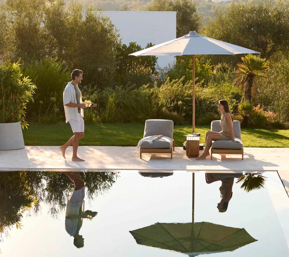 La tumbona Vista de Cane-line Design presenta una estética contemporánea y minimalista, elaborada en teca certificada de calidad Grade A. Con líneas puras y una superficie táctil, aporta un lujo discreto y natural a los espacios exteriores — invitando al descanso bajo el sol, tanto junto a la piscina como en una terraza privada o en un entorno hotelero refinado.